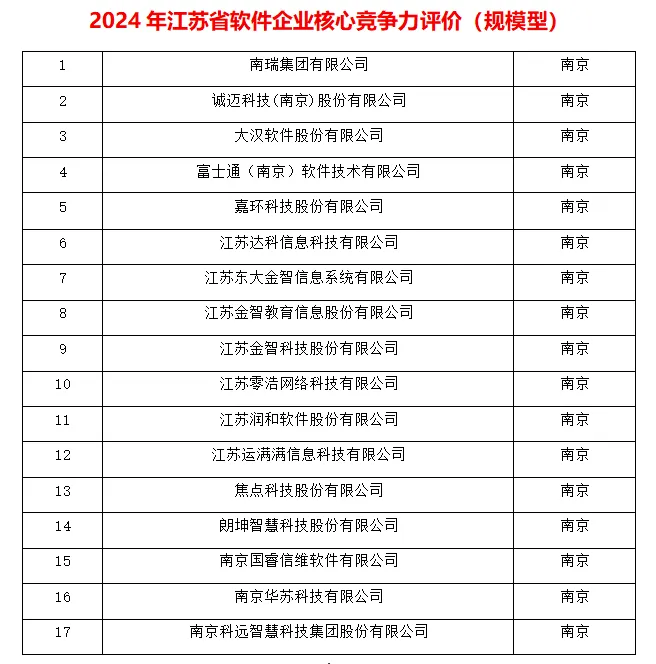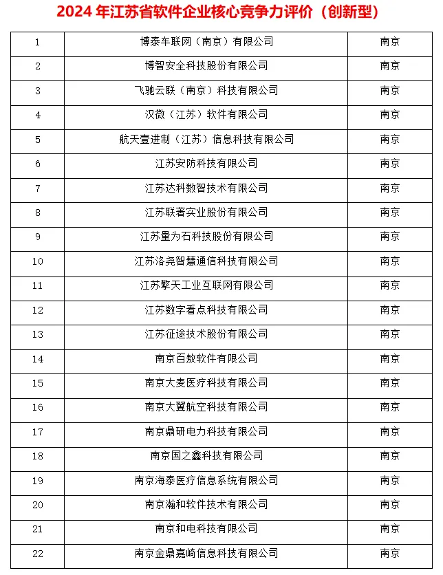 记者从江苏省工信厅获悉,近日,江苏省软件行业协会发布2024年江苏省软件企业中枢竞争力评价后果公示名单,共5类156家企业入选,波及省内11个设区市。